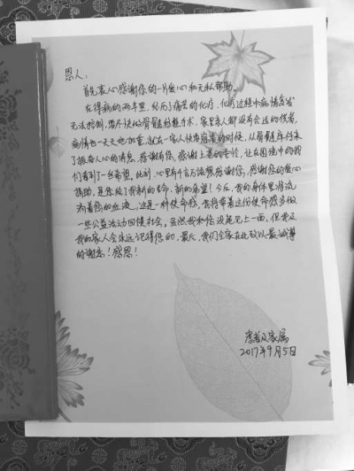 受捐者一家写的感谢信。