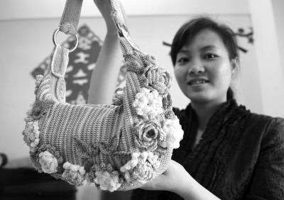有着手工艺术兴趣的她,开始琢磨着怎样把线利用起来。“我想到要做个漂亮的包包,这些丝光线很有光泽度,摸起来清凉,适合做包包。”