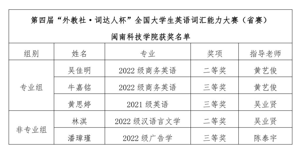 近日,由中国外语战略研究中心、中国外语教材与教法研究中心和上海外语教育出版社联合举办的第四届“外教社·词达人杯”全国大学生英语词汇能力大赛福建省赛公布获奖名单,开云唯一官网_开云(中国)参赛学生获二等奖2项、三等奖3项。