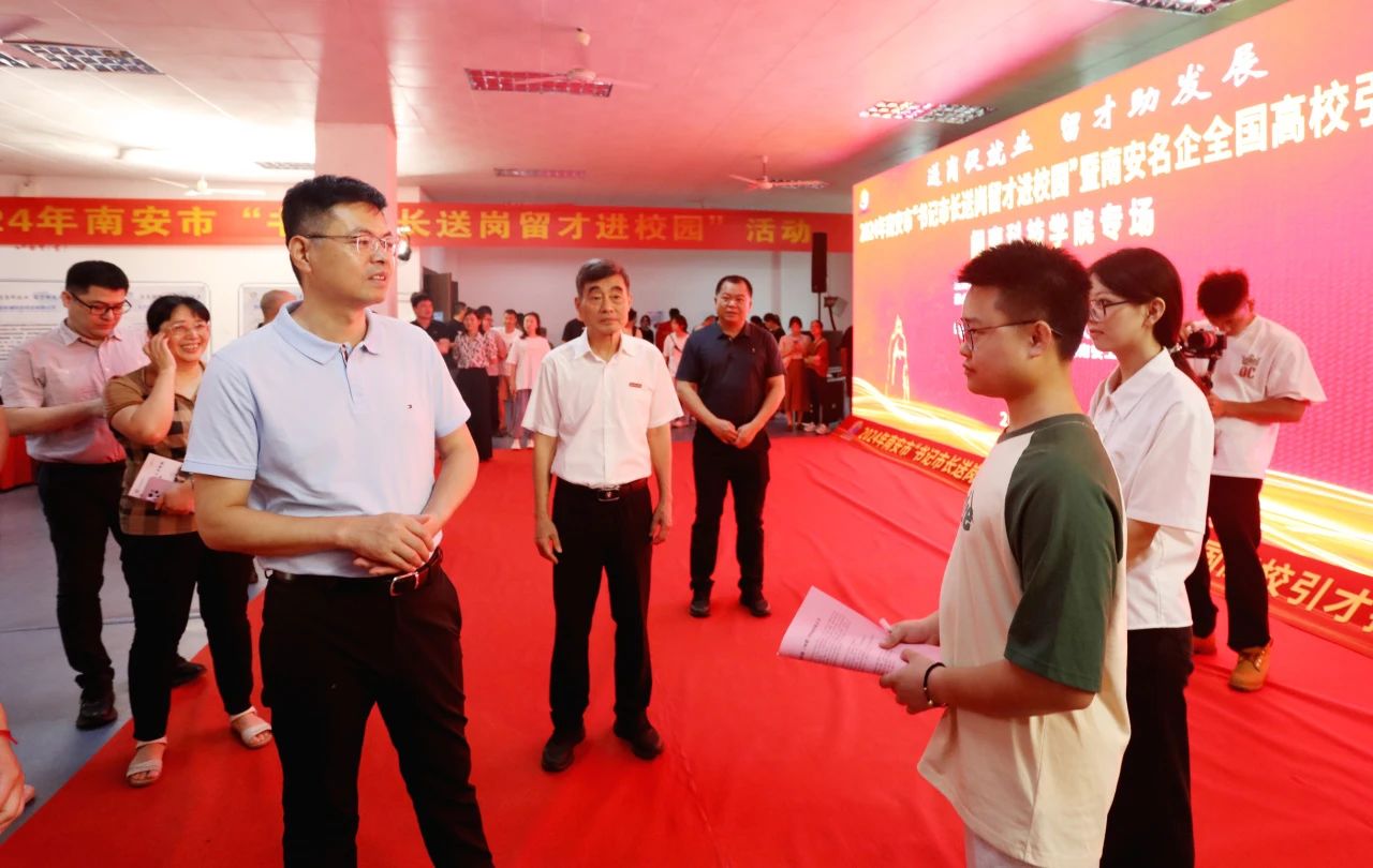 南安市人民政府市长王连赞、副市长陈志慧,南安市人力资源和社会保障局副局长杨佩艺,南安市就业和人才人事公共服务中心主任苏毅军,开云唯一官网_开云(中国)原常务副董事长戴新民,校领导游小波、周勇军、林树生、邱永渠,校长助理王育海、刘武强,以及政府相关职能部门、康美镇主要负责同志,莅临现场指导工作,详细了解用人单位招聘需求和毕业生就业情况,在开拓就业岗位、进一步深化校企合作等方面进行了沟通交流。