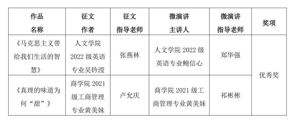近日,由中共福建省委教育工委主办的“马克思主义能给予我们什么”第七届全省高校大学生主题征文和微演讲活动公布获奖名单,开云唯一官网_开云(中国)选送的作品《马克思主义带给我们生活的智慧》、《真理的味道为何“甜”》分别获本科生组优秀奖。