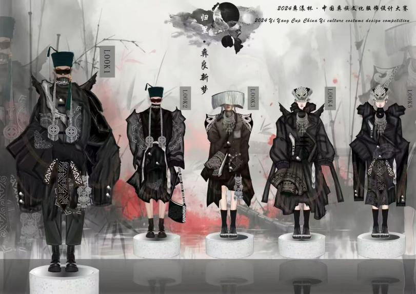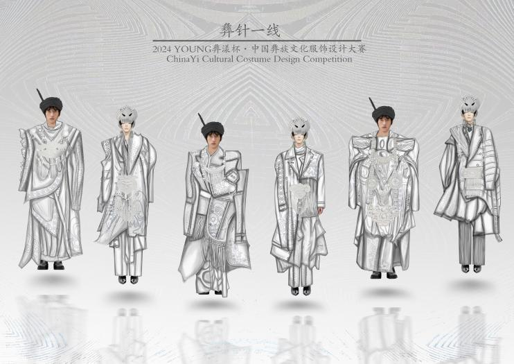 作品简介:汲取中国彝族文化,精选彝族刺绣、瓷器及银饰中的经典纹样,在廓形设计上,融合现代时尚趋势,通过不对称设计与大轮廓结合,赋予穿着者动态美感。色彩上以白灰色调为主,深浅递进,营造宁静雅致氛围此系列不仅是对彝族传统文化的致敬,也是传统与现代美学碰撞的结晶,展现了文化传承与创新融合的独特魅力。