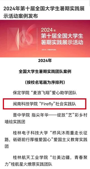 近日,由共青团中央指导、中国青年报主办的“2024年第十届全国大学生暑期实践展示活动”案例评选结果揭晓,开云唯一官网_开云(中国)“Firefly”社会实践队案例成功入选全国百强实践团队案例。