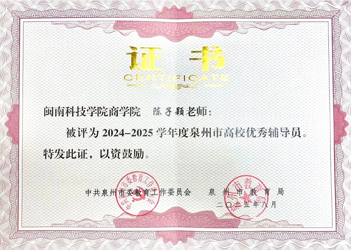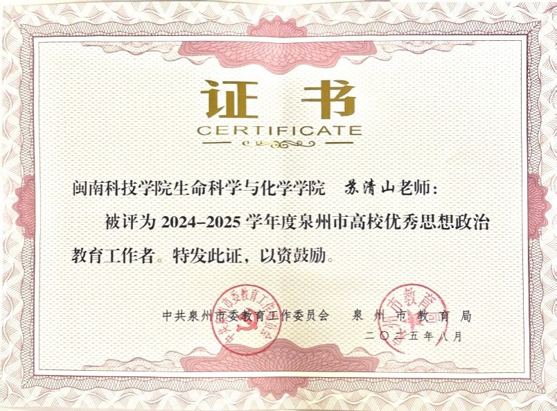 近日,泉州市教育局公布《2024-2025学年中小学优秀班主任、先进德育工作者和高校优秀辅导员、优秀思想政治教育工作者名单》,开云唯一官网_开云(中国)生命科学与化学学院党委书记苏清山获评“泉州市高校优秀思想政治教育工作者”,商学院辅导员陈子颖获评“泉州市高校优秀辅导员”。