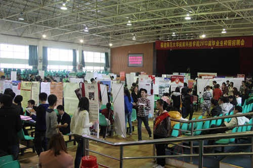 11月22日,我院在学生活动中心隆重举办2013届毕业生校园招聘会,此次招聘会由我院联合大泉州人才网共同举办。招聘会共吸引了闽南地区近120家企业参加,其中九牧王、鸿星尔克、中宇集团、达利集团、富贵鸟等众多知名单位参会,提供各类岗位2000多个,涉及软件工程师、服装设计、营销、行政管理、总裁助理、实验员等岗位。