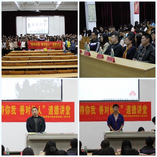 6日,2014级信息管理与信息系统专业举办“诚待你我,善对他人”主题道德讲堂活动。活动围绕“述一个道理”、“观一部短片”、“ 讲一段故事”、“唱一首歌”、“发一条微博”、“宣一则期望”、“听一番感悟”、“签一个名字”八个环节展开。活动在一首“友善”为主题的诗歌中“述一个道理”开场;在“观一部短片”环节中,以一位流浪汉被善待的感人故事,宣传道德正能量;在“讲一段故事”环节中,同学们踊跃发言,讲述自己身边被善待的生活情节;在“唱一首歌”环节后,同学们通过“发一条微博”发表自己对“善待”的看法,并承诺:“无论是朋友还是陌生人遭到了危险,我们都要大胆地承担下来,尽力帮助人家,不要过多考虑自己要付出多大代价。”在“听一番感悟”中,经济管理系副主任陈晓川分享了善待他人,也得到他人善待的故事,他希望同学们终生铭记“诚待你我,善对他人”这个承诺,以真诚和善良对待身边的人和事,以“诚待你我,善待他人”的态度与人交往,在学习生活中形成良好融洽的人际关系,在实践中弘扬道德新风尚,传播社会正能量。