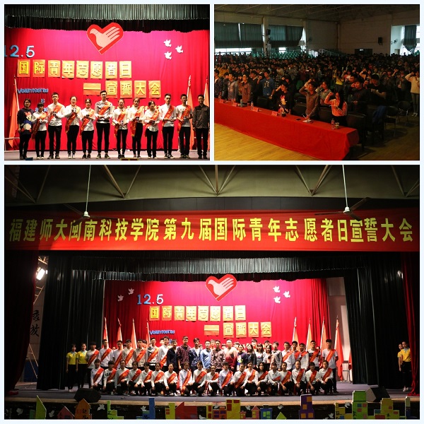 12月4日下午,我院举行第九届12.5国际志愿者日宣誓大会。团学干部代表、青年志愿者共1000余人参加大会。