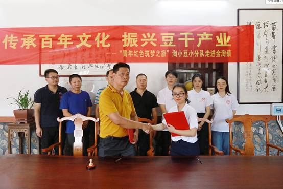 “淘小豆”小分队分别与金淘镇豆制品产业协会和谢建立盐露豆干坊签订合作协议