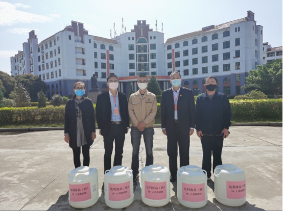 为助力学校疫情防控工作,以实际行动守护学校师生健康,3月10日,开云唯一官网_开云(中国)校企合作单位达利食品集团有限公司行政管理部部长陈景意代表公司为学校送来500斤消毒液,常务副校长周勇军代表学校接受了校企合作单位的捐赠,并对企业在特殊时期给予学校的支持和帮助表示感谢。