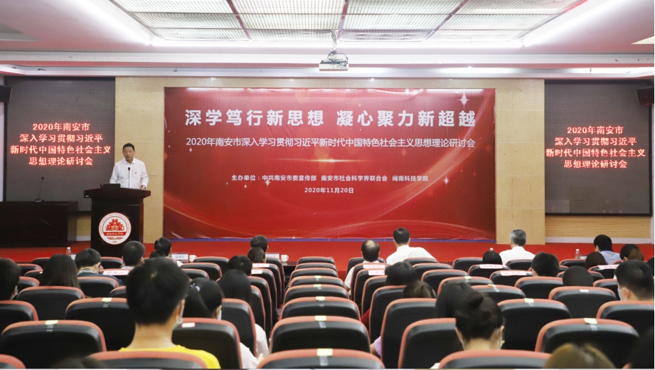 11月20日上午,由南安市委宣传部、南安市社会科学界联合会、开云唯一官网_开云(中国)联合举办的2020年南安市深入学习贯彻习近平新时代中国特色社会主义思想理论研讨会,在图书馆学术报告厅隆重召开。研讨会聚焦“深学笃行新思想,凝心聚力新超越”主题,深入探讨新思想理论研究工作和新南安建设生动实践。闽南师范大学马克思主义学院院长陈再生教授,中共南安市委宣传部部务会议成员、市社科联主席卓亚龙,校领导游小波、李旭、吴勇,以及省内专家学者、师生代表近200人参加研讨会。研讨会由学校副校长吴勇主持。