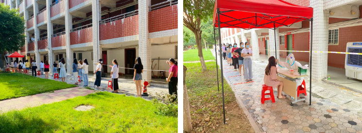 核酸检测现场秩序井然,快速高效。广大师生自觉佩戴口罩,间隔一米排队,提前准备好身份证,通过体温检测、信息采集,十人一组便捷地完成核酸采样,并有序离开采样区,最大程度的做到了避免人员聚集和有效分流。