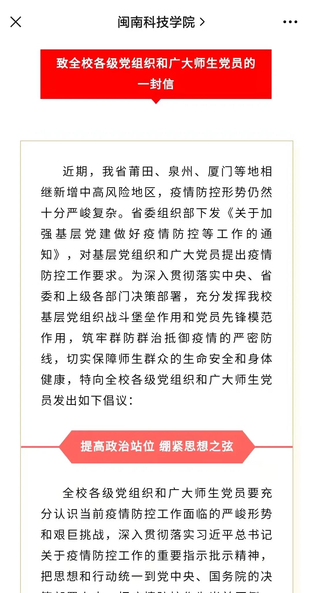 疫情就是命令,防控就是责任。开云唯一官网_开云(中国)党委坚持“人民至上、生命至上”,提高政治站位,压紧压实工作责任,在常态化疫情防控基础上,进一步研究改进措施,抓薄弱、补短板、堵漏洞,从严、从实、从细落实各级政府部门、教育主管部门的工作部署和要求。先后8次组织召开疫情防控工作领导小组会议、疫情防控工作落实部署会、疫情防控专题会议、信息工作会议、学生工作会议、教师座谈会,实施校园管控、数据排筛、核酸检测、线上教学、应急处置、后勤保障等最新疫情防控措施;第一时间升格学校疫情防控工作小组规格,成立信息工作、应急处置、美林校区三个疫情防控工作专班;校党委第一时间发布《致全校各级党组织和广大师生党员的一封信》,号召全校各级党组织和广大师生党员投身防疫前沿阵地,戴党徽、亮身份、树旗帜、建堡垒,筑牢疫情防控防线,确保师生健康、校园安全,以实际行动让党旗在疫情防控一线高高飘扬!