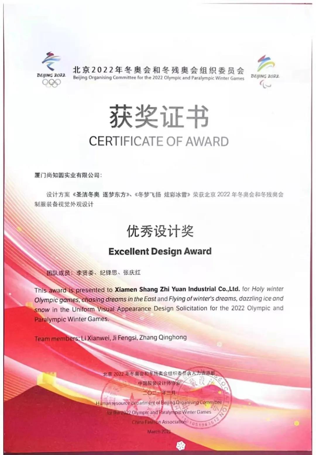 证书显示,纪锋思参与的两个冬奥制服装备方案《圣洁冬奥,逐梦东方》和《冬梦飞扬,炫彩冰雪》获得优秀设计奖。