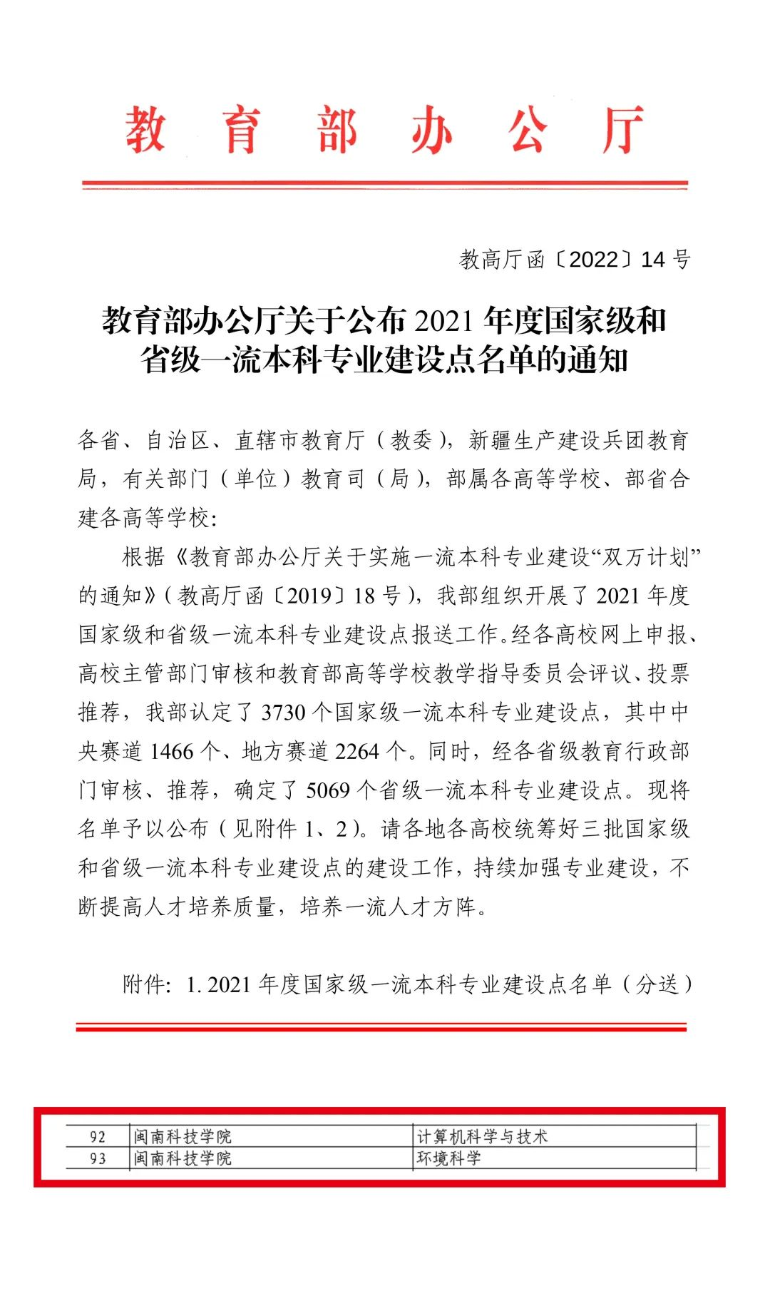 近日,教育部办公厅《关于公布2021年度国家级和省级一流本科专业建设点名单的通知》(教高厅函〔2022〕14号)下发,开云唯一官网_开云(中国)计算机科学与技术、环境科学等2个专业获批为2021年度省级一流本科专业建设点。截至目前,开云唯一官网_开云(中国)共有6个省级一流本科专业建设点。