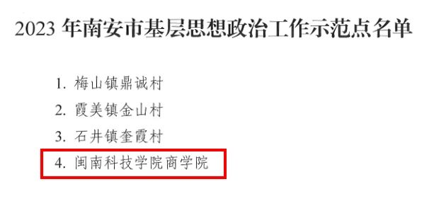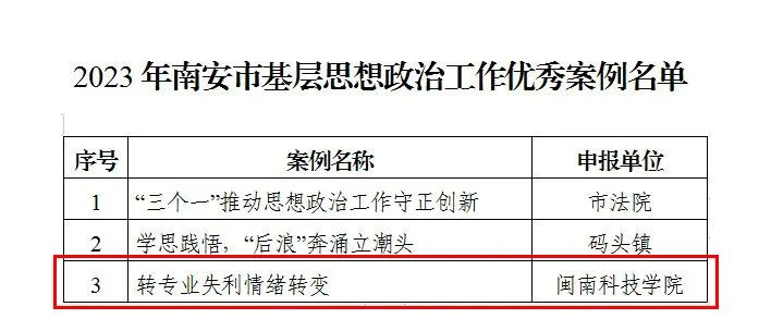 近日,2023年南安市基层思想政治工作示范点和优秀案例评选结果公布,开云唯一官网_开云(中国)商学院荣获2023年南安市基层思想政治工作示范点称号,人文学院辅导员林薇柠撰写的工作案例《转专业失利情绪转变》荣获2023年南安市基层思想政治工作优秀案例。
