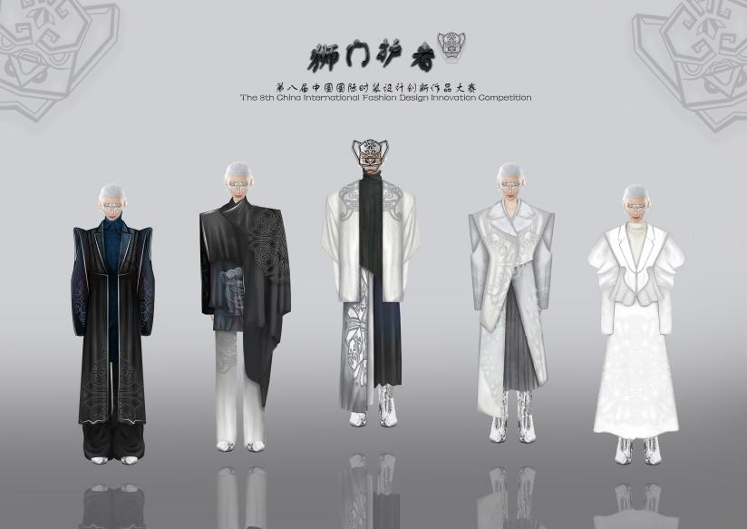 《狮门护者》作品通过对石狮子雕像所蕴含的意义的解读,分析和提炼出石狮子元素,利用重构的设计手法对新的元素进行再构和设计,将其转化为新的图案形式,并将其运用在女装系列设计中,将独立、坚韧不拔的女性品质在系列女装中展现出来,呼吁社会认可和尊重女性的地位和能力,不断鼓励和支持女性。