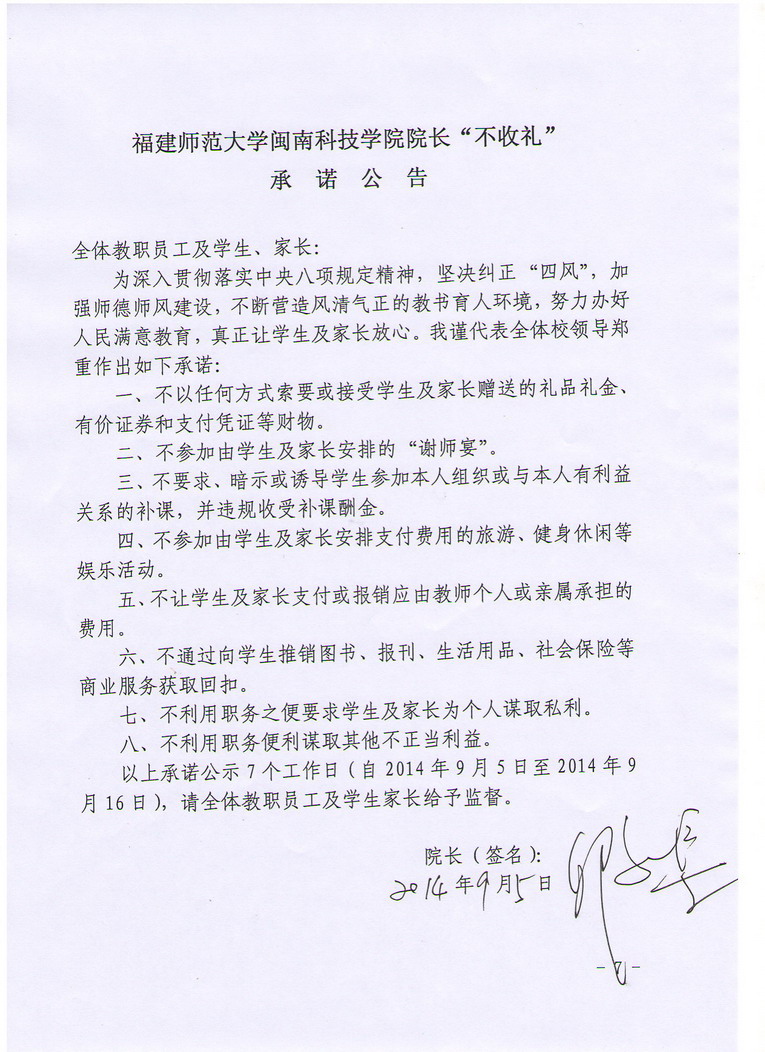 福建师范大学开云唯一官网_开云(中国)院长“不收礼”承诺公告