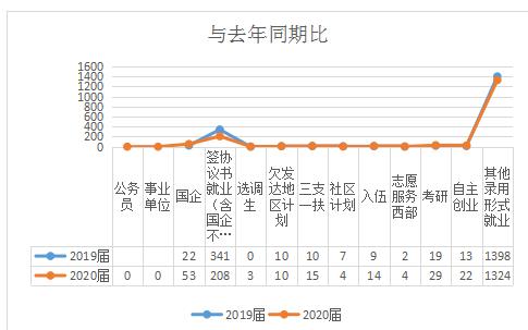 受疫情影响,与2019年同期相比,2020届毕业生整体就业情况比2019届略有下降,但考研、考公、创业及入伍的毕业生略有增加。就业对比情况如图9。