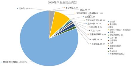 (2)毕业生就业情况分析。截止至2020年12月17日,2020届毕业生初次整体就业人数1734人,综合就业率84.22%,其中签约人数309人;其他录用形式就业人数1425人。有29人考上研究生,36人参加国家地方项目就业,14人应征入伍,22人自主创业。2020届毕业生就业类型如图8。